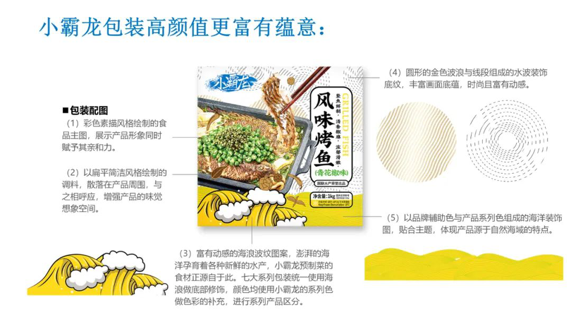 包裝的煥新則在設計上進行了大膽的色彩運用。圓形的金色波浪與線段組成的水波裝飾底紋,豐富畫面底蘊;動感澎湃的海浪波紋圖案,預示小霸龍預制菜的食材正源自于此,是小霸龍預制菜的一大特色——健康營養的各種新鮮的水產食材,同時用不同色彩填充海浪,用以區分產品系列。豐富的色彩搭配讓小霸龍產品包裝更具視覺沖擊力,成為吸引消費者選購的一大亮點。