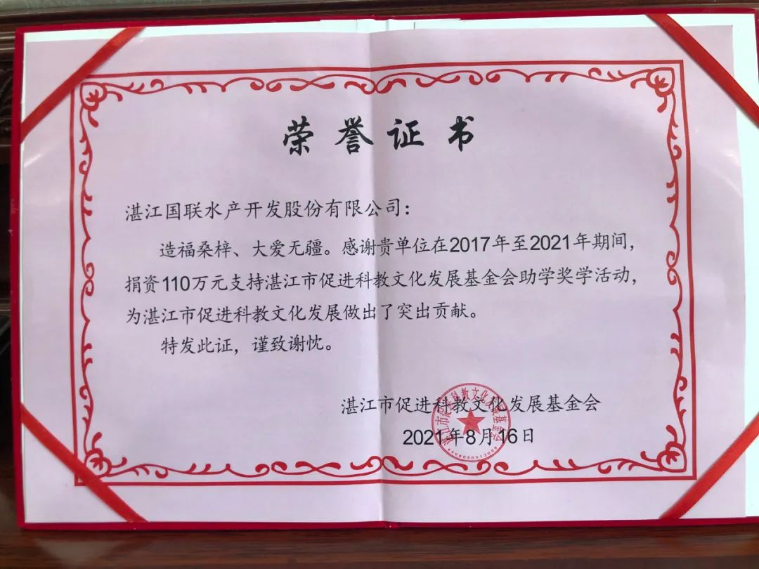 扶貧先扶志,扶貧重扶智。據悉,國聯水產集團先后共捐贈慈善公益項目約4000多萬元。2021年,國聯水產集團向湛江市促進科教文化發展基金會捐款110萬元,為湛江科教文化發展盡心盡力。愛心無止境,公益事業亦無止境。未來,國聯水產集團始終如一,將源源不斷的輸出愛心,聚沙成塔,以愛心繼續溫暖中華大地!